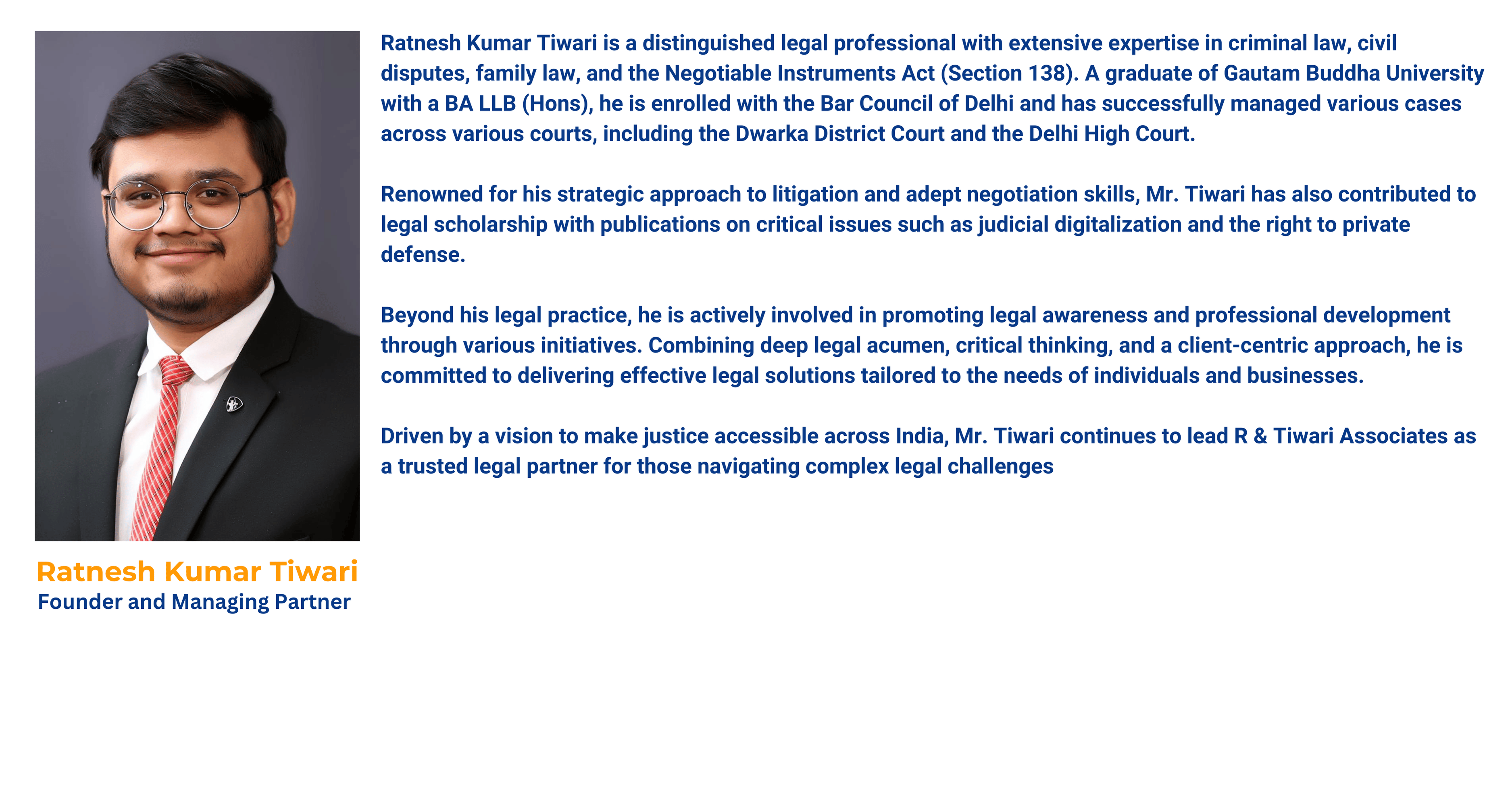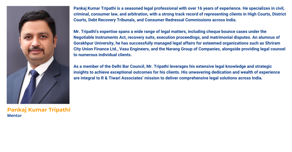 R & Tiwari Associates is a premier law firm committed to delivering comprehensive legal solutions to individuals, businesses, and organizations across India. With a proven track record in family law, civil disputes, criminal cases, and consumer matters, our firm is recognized for addressing even the most complex legal issues with a steadfast focus on justice, precision, and client satisfaction.